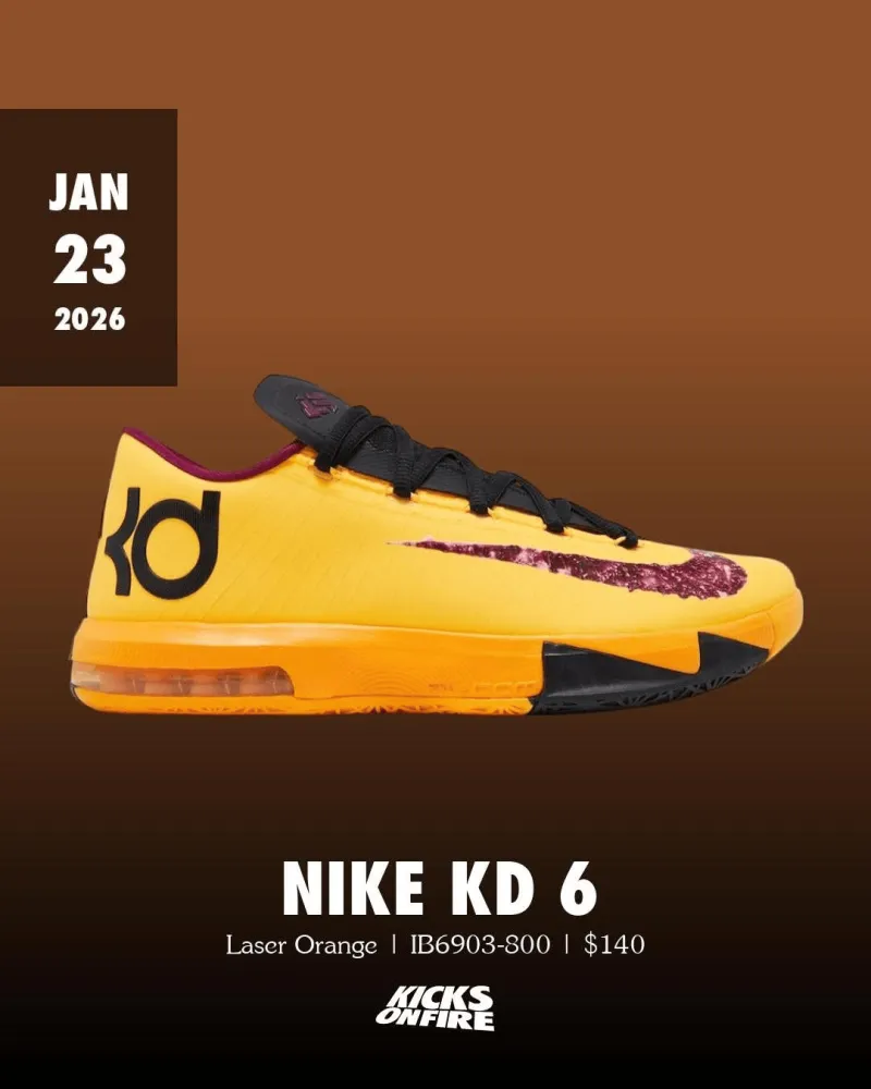 虎扑09月11日讯 “花生酱和果冻”配色Nike KD 6 “Peanut Butter & Jelly”(PBJ)确定将于2026年1月23日复刻上市,货号IB6903-800,发售价1099元。