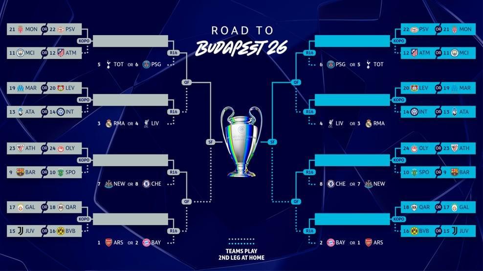 本次抽签涉及在联赛阶段排名第九至第二十四位的球队,联赛阶段排名前八的球队将自动晋级十六强。