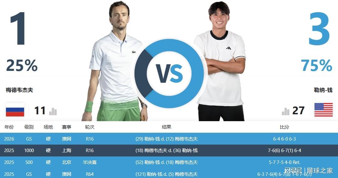 中网半决赛,勒纳·钱战胜在第三盘伤退的梅德维德夫;紧接着的上海大师赛第四轮,梅德维德夫2-1战胜勒纳·钱;今年1月份的澳网第四轮,勒纳·钱直落三盘战胜梅德维德夫。