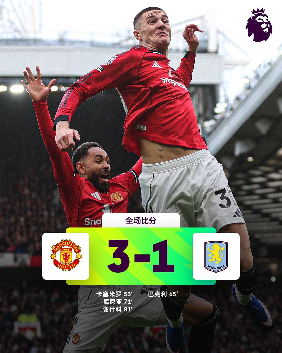 3-1复仇阿斯顿维拉!曼联稳守前三